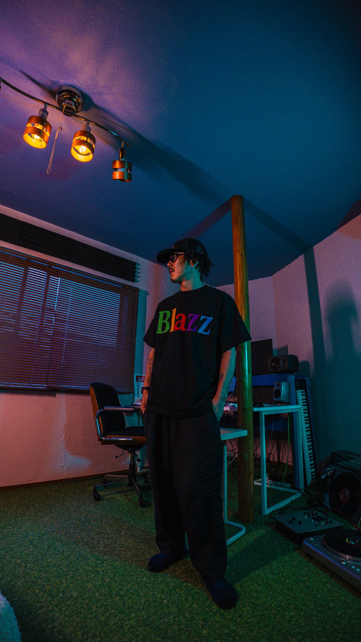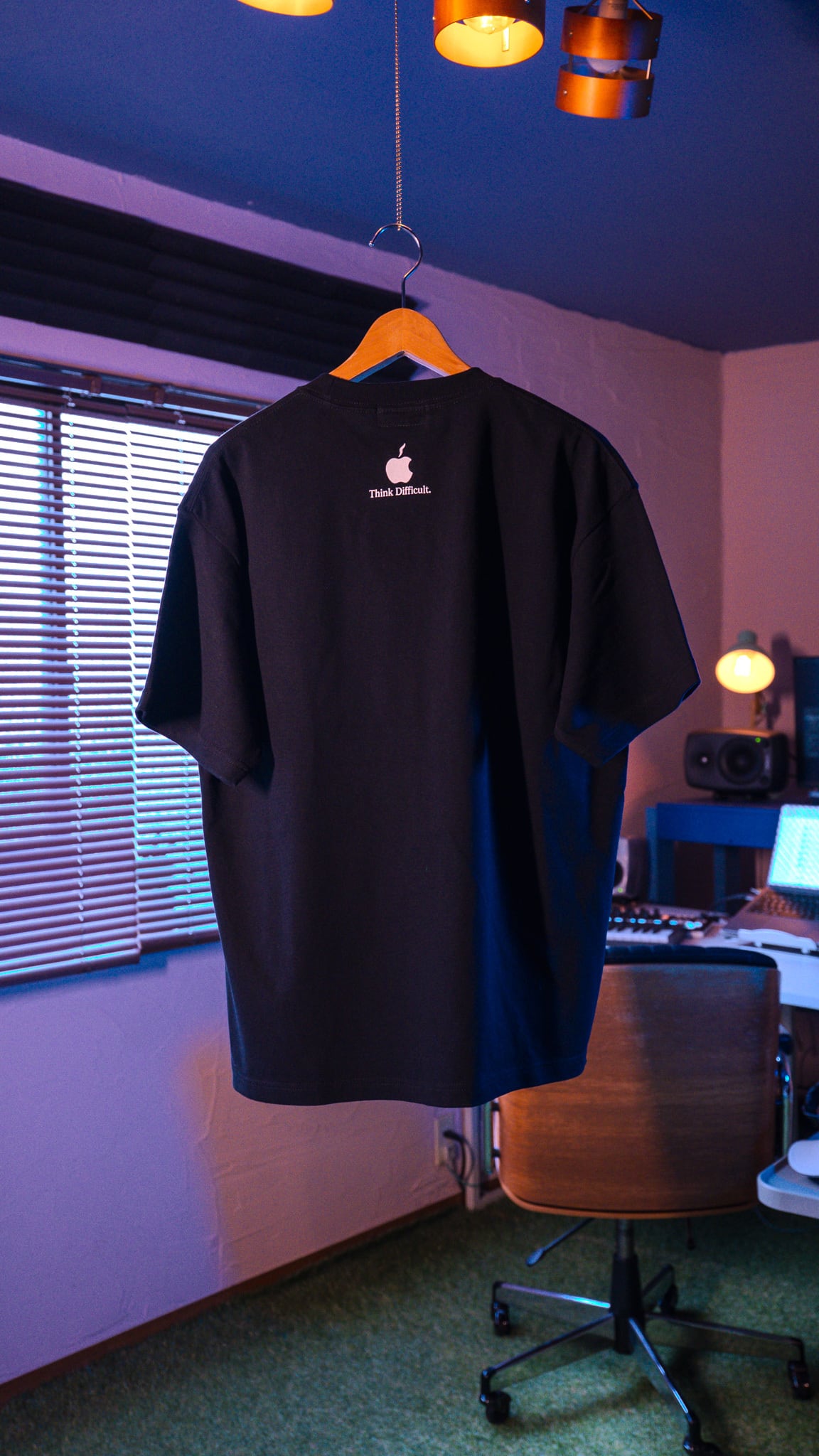 某テック企業のヴィンテージTシャツをサンプリングした、印象的なレインボーカラーの“BLAZZ”ロゴが目を引く1枚。背面には“Think Difficult.”の皮肉を効かせたグラフィックをプリントし、遊び心とメッセージ性を両立させたデザインに仕上げました。
