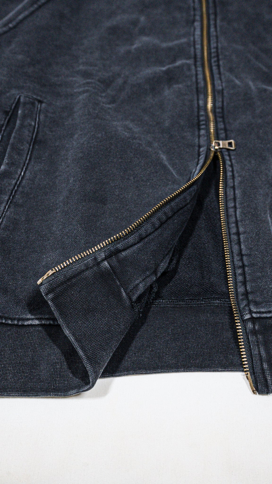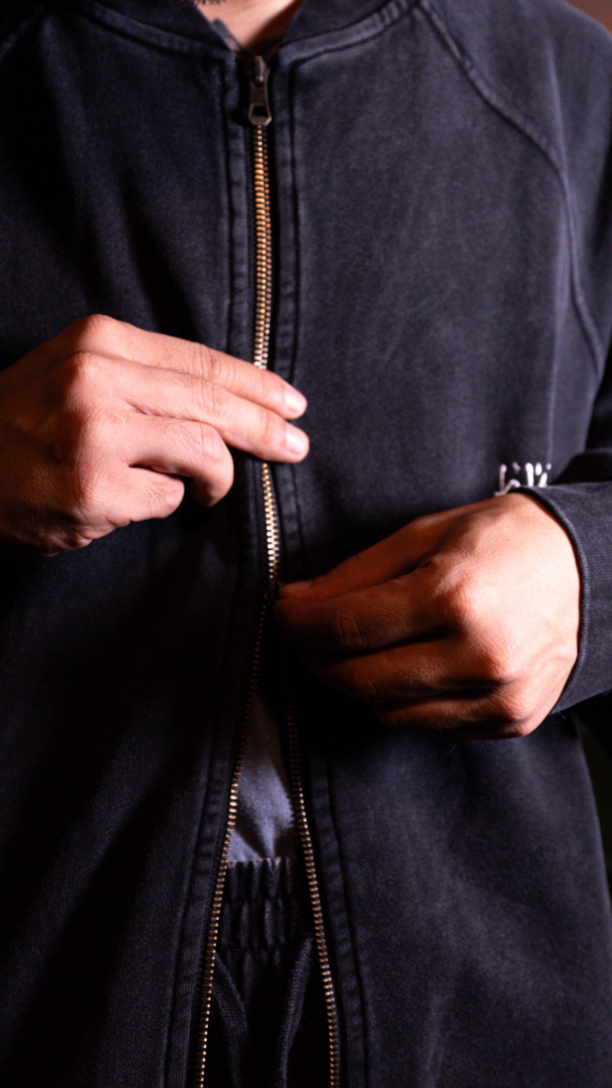 ヴィンテージライクなウォッシュド加工と立体的なカッティングが特徴の、12oz裏パイル仕様スウェットブルゾン。