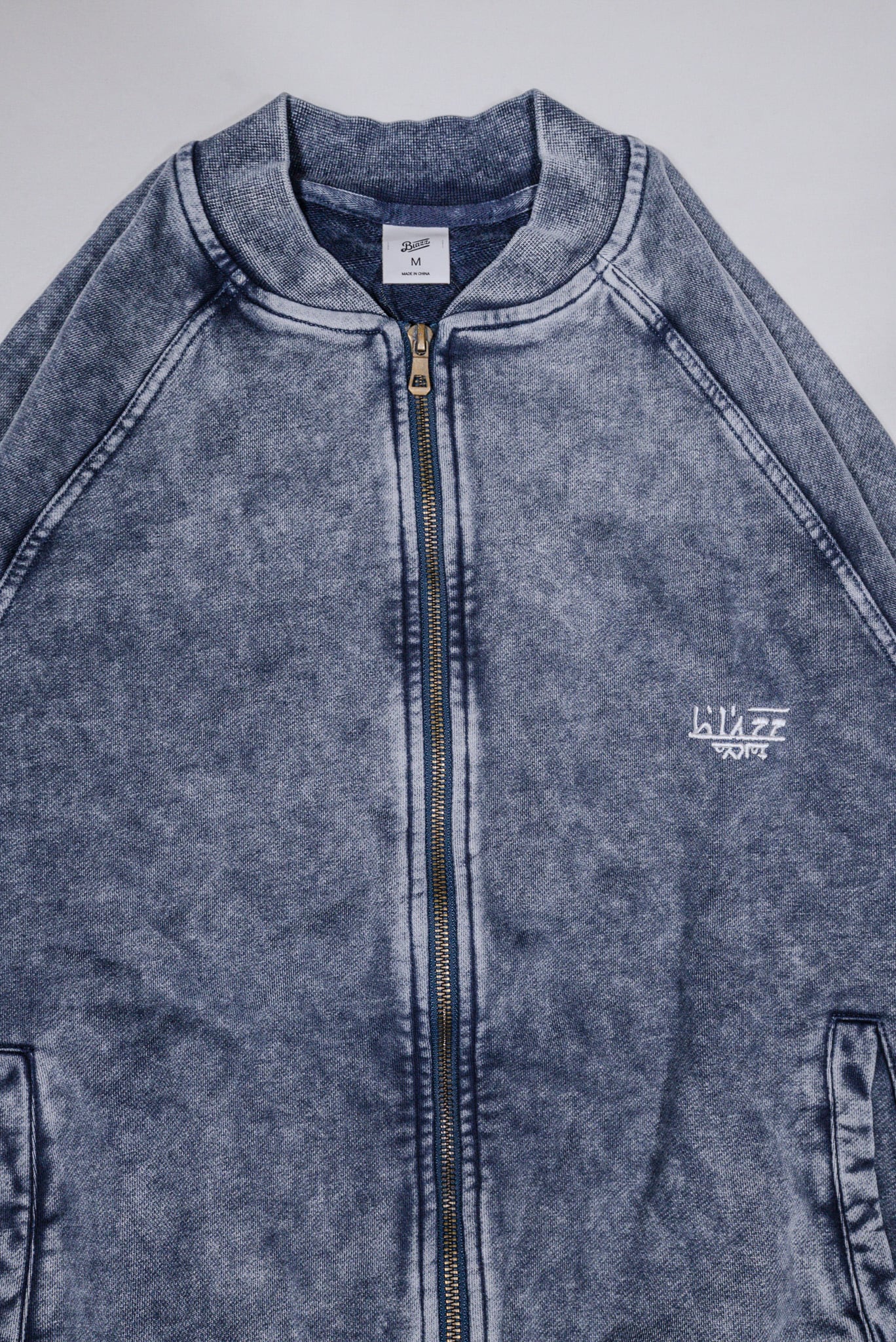 ヴィンテージライクなウォッシュド加工と立体的なカッティングが特徴の、12oz裏パイル仕様スウェットブルゾン。