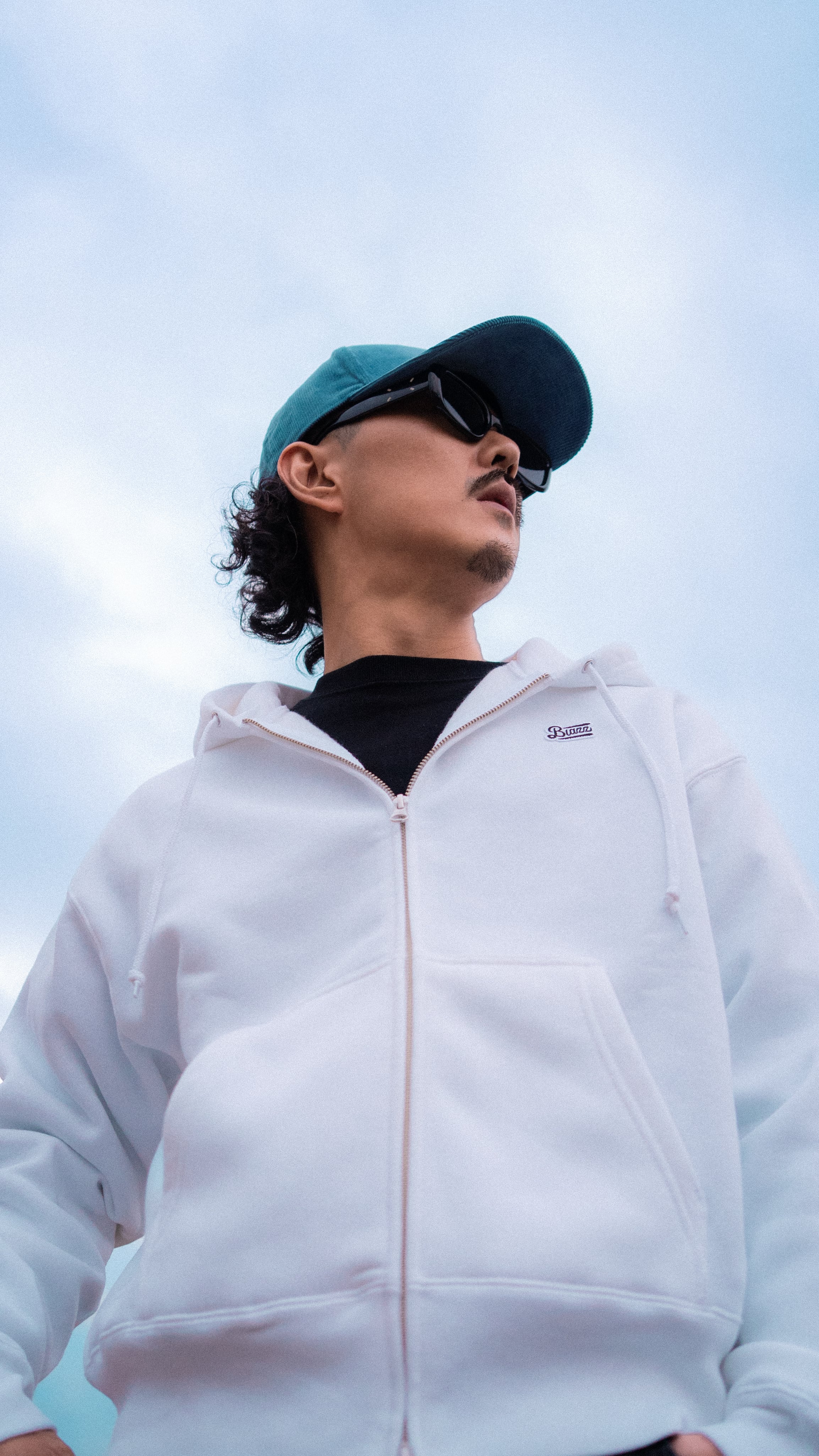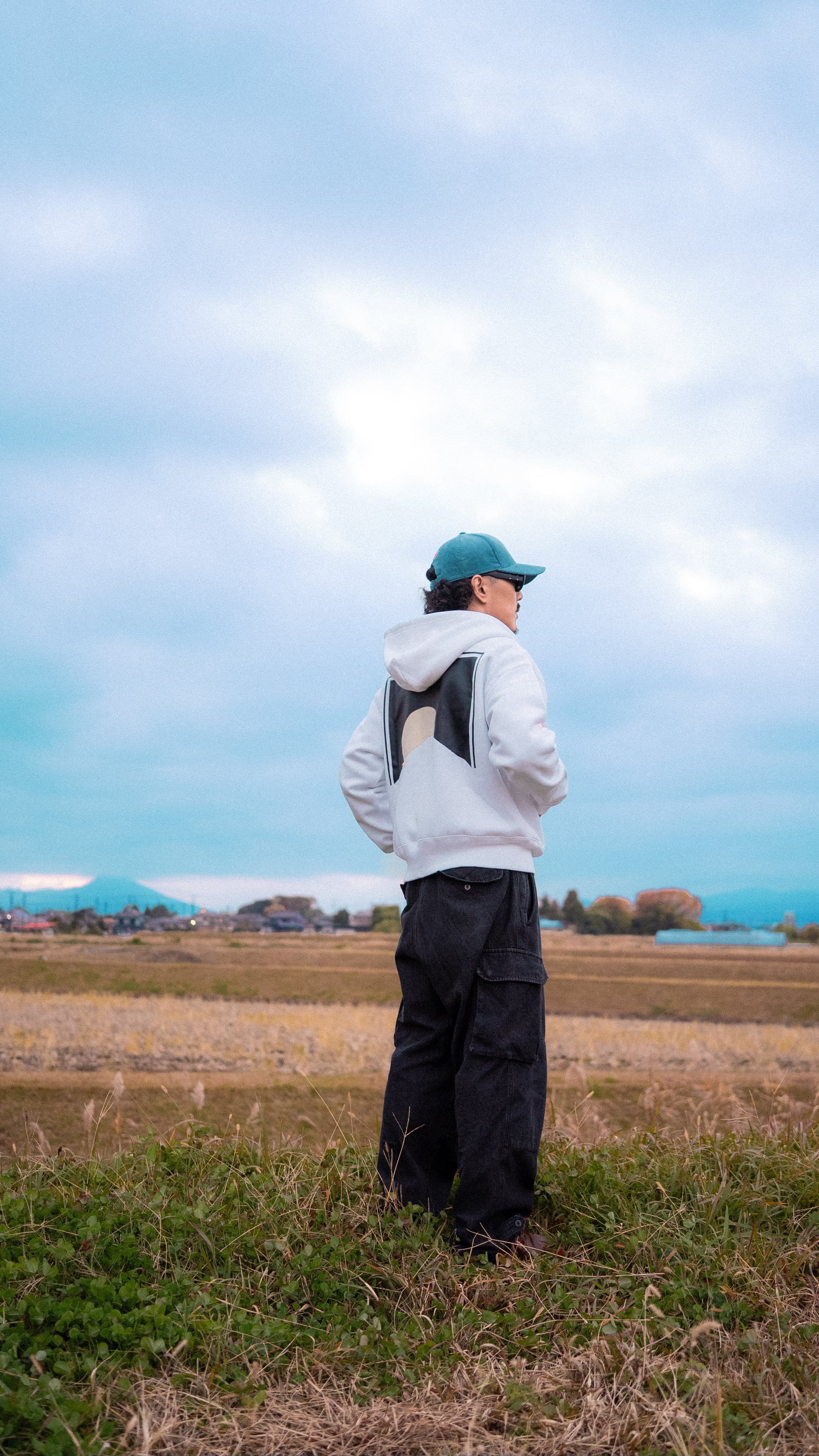 10ozヘビーコットン裏起毛を使用し、しっかりとした厚みと柔らかな着心地を両立。身幅・肩幅を広めに、身丈をやや短めに設定したボックスシルエットで、リラックス感とモダンなバランスを演出します。